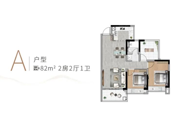 除了园林设计,项目的户型也有不少亮点。建面约82㎡2+1房2厅1卫户型,格局方正,竖厅设计,三开间朝南采光不错。