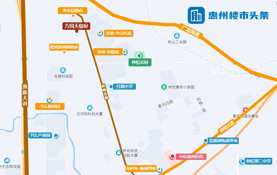 项目所在区域交通便利,广龙高速、惠新大道、仲恺大道等城市交通道路完善,莞惠城轨惠环站也在附近。此外,片区的生活配套也非常成熟,项目的学区有红旗小学和仲恺第二中学, 距离项目不远的还有仲恺公园、中信惠州医院、T-Park等设施。