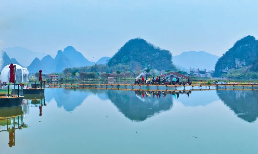 2、中午午餐,13:30到达【九龙小镇】这里山清水秀、风景如画,有万亩峰林,上千亩花海。景区内石山奇峰林立、溶洞奇特,形成了独特的生态环境,素有”飞借桂林山,漓江换明迳,游廊迎奇景,簪峰镇九龙”的美称。漫步在林间小道上,哼着小曲悠然自得。