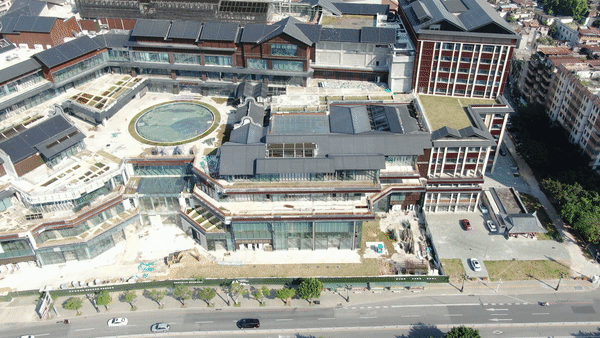 从航拍图可以看到,项目的外部装修已基本完成,但内部还堆积着部分装修材料,尚未完全完工。