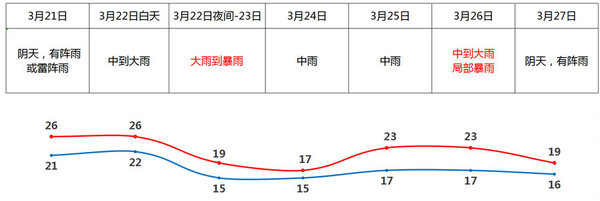 广东省三防办、省应急管理厅、省气象局提醒:3月21日夜间—23日,我省将有一次明显降雨和降温过程:粤北和珠江三角洲市县有大到暴雨局地大暴雨,其余市县有中到大雨局部暴雨,雷雨时部分市县伴有7级~9级短时大风、局地小冰雹、短时强降水等强对流天气;