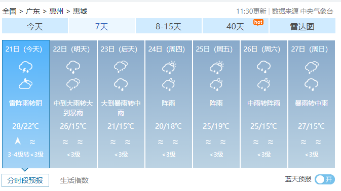 3月20日13时,惠州市气象台发布惠州重大气象信息。预计,未来一周我市有两次明显降水降温过程,并伴有短时强降水、雷暴和6~8级短时大风等强对流天气。
