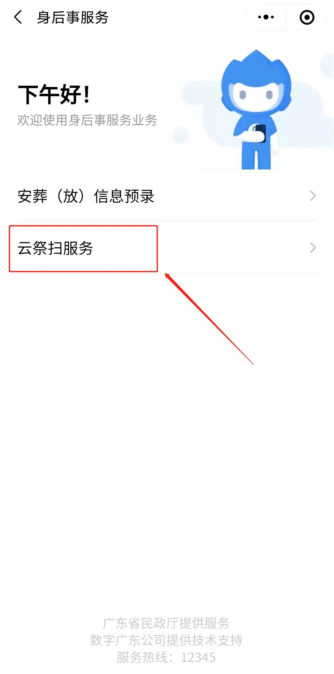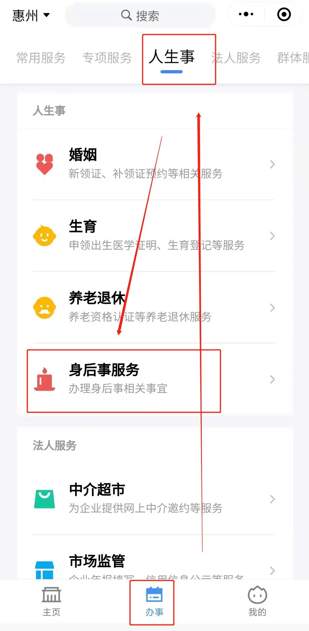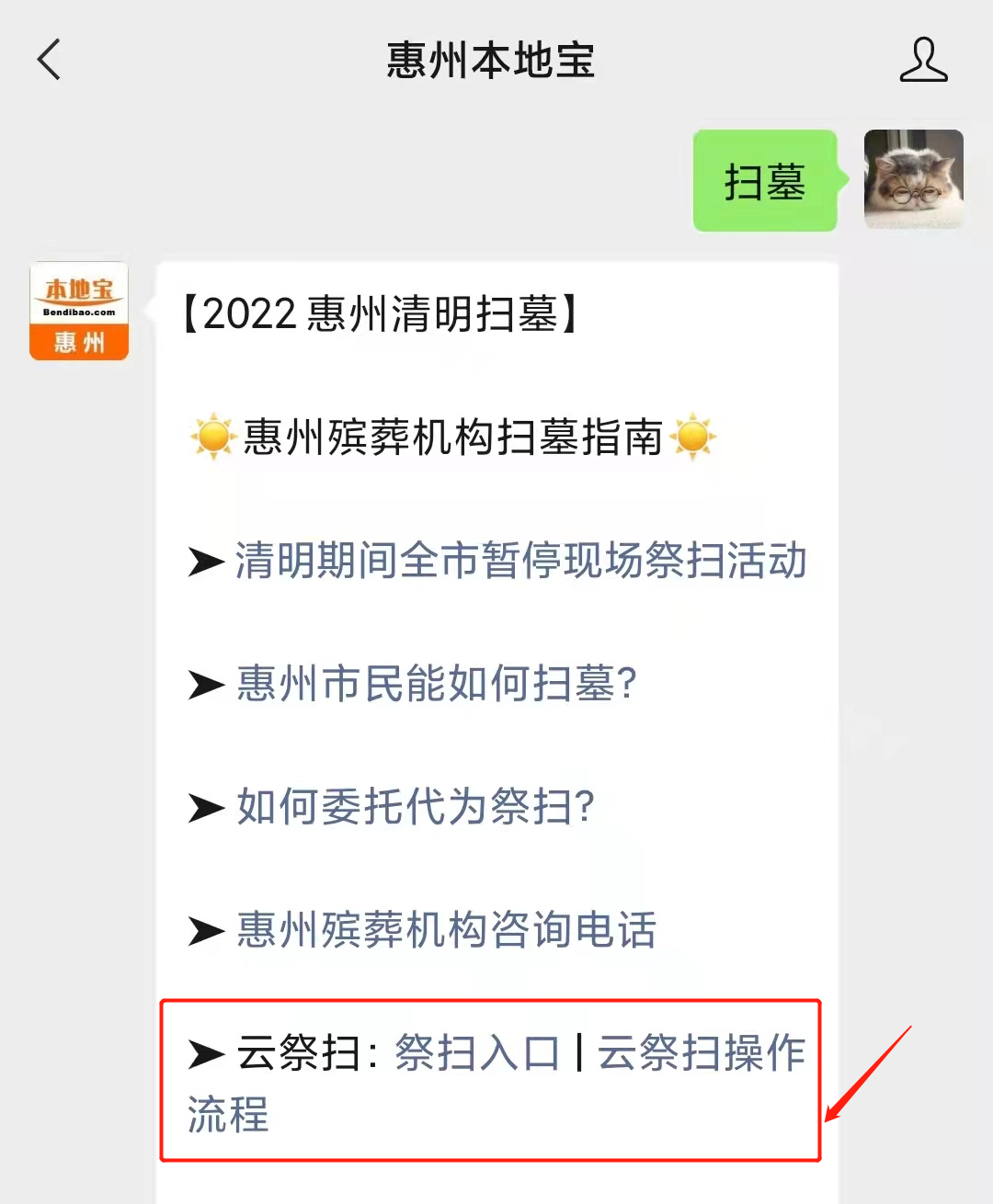 1、进入粤省事小程序,然后直接搜索“云祭扫”、或者点击下方的“办事”-“人生事”-“身后事服务”-点击“云祭扫”服务。点击下方公众号名片关注“惠州本地宝”,在微信对话框回复【扫墓】,即可获取粤省事云祭扫入口、详细的操作流程,各大墓园咨询电话等等。