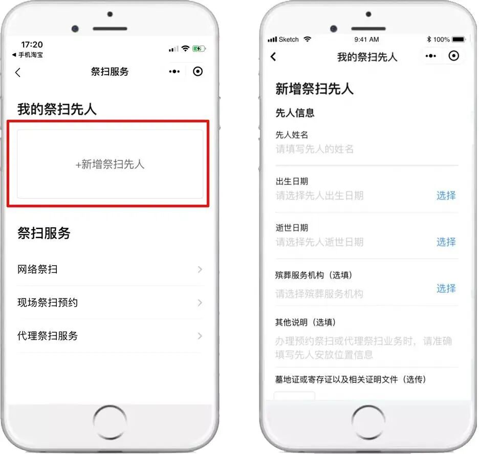 2、首次进入“云祭扫”服务,需要新增祭扫先人信息,点击“+新增祭扫先人”,填写先人信息。填写完成后,点击提交。
