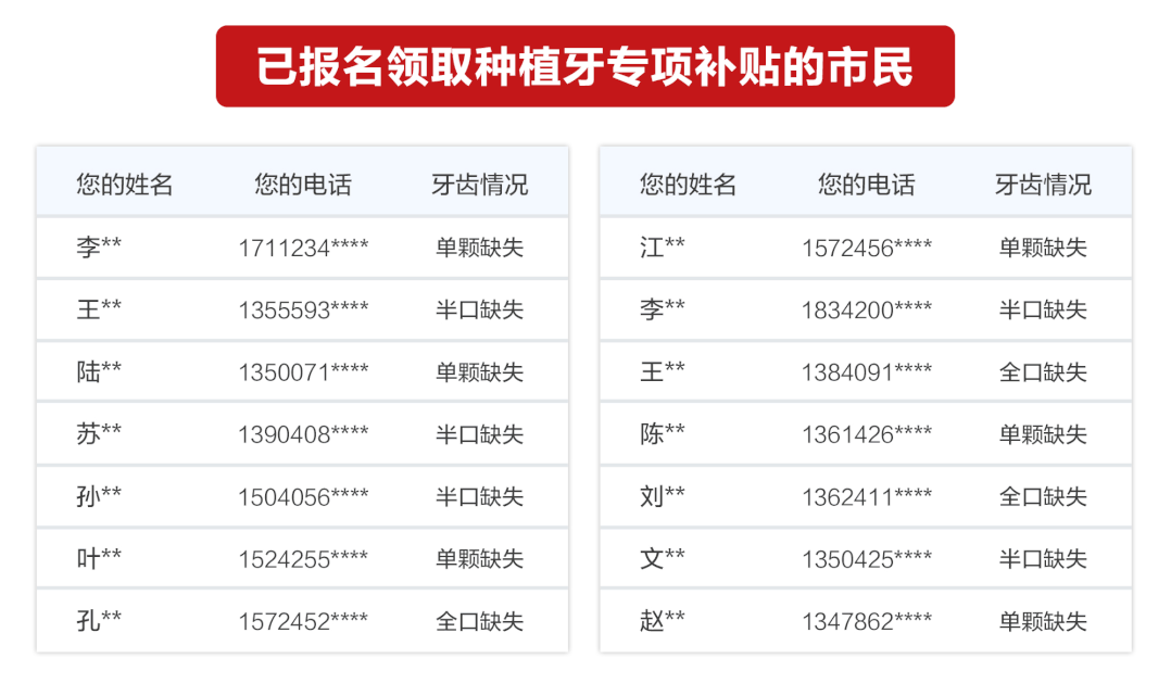 牙齿缺失、松动、残根、残冠或烤瓷牙损坏、活动假牙不适,多颗、半口、全口缺牙市民优先;牙齿不齐、牙齿外凸、畸形牙、残缺破损、牙齿稀疏等口腔问题人群。