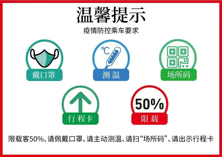 请各位市民在乘坐公共交通工具时,做好个人防护佩戴好口罩,并配合测量体温、主动扫描和出示“场所码”、出示行程卡、出示48小时核酸阴性证明或24小时内核酸检测凭证(记录)。
