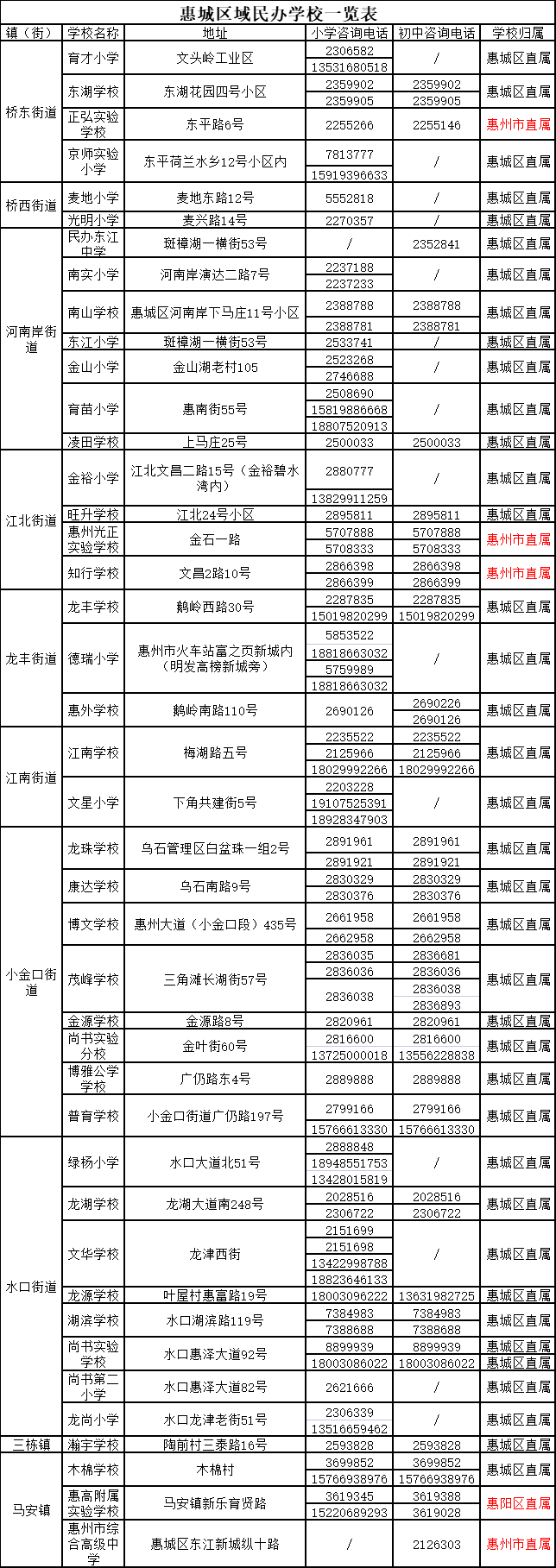 首先,我们需明确一个概念:惠城区域内民办学校,包含惠州市直属和惠阳区直属民办学校,大家耳熟能详的知行学校、正泓实验学校、惠州光正实验学校、惠州市综合高级中学初中部、惠高附属实验学校(在惠城区招生部分)等5所学校及惠城区38所民办学校,都可通过摇号入学的方式就读。