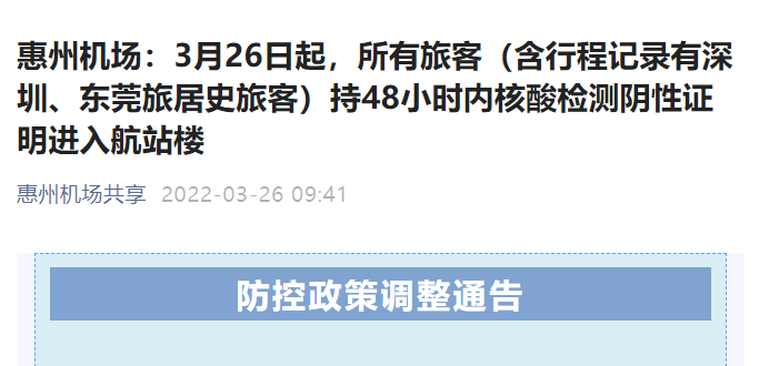 接惠州市疫情防控相关部门通知,自3月26日零时起,十四天内行程记录有深圳、东莞旅居史的旅客,核酸检测阴性证明由24小时调整为48小时。所有从惠州机场出发的旅客,持有48小时内核酸检测阴性证明,出示粤康码“绿码”,体温检测正常,即可进入航站楼。