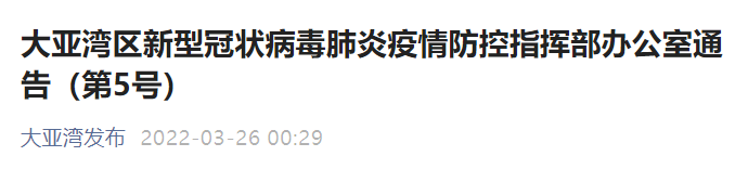 自3月16日以来,在全体市民群众的共同努力下,我区已在全区范围内完成四轮全员核酸检测,核酸检测结果均为阴性,全区疫情防控形势总体平稳。为继续实施差异化疫情防控举措,从严从紧从细做好疫情防控工作,统筹好疫情防控和经济社会发展,确保群众正常生产生活平稳有序,以最小的代价实现最大的防控效果,经区新冠肺炎疫情防控工作领导小组组织专家评估,于2022年3月26日0时起,大亚湾区全区除封控区、管控区以外,凭48小时内核酸检测阴性证明通行。农贸(集贸)市场、药店、批发市场、商场超市等重点场所严格落实测温、扫场所码、限流、保持1米间距等管控措施。行程卡带星的群众进出村(社区)、居住小区、各类公共场所、乘坐公共交通工具等须凭48小时核酸检测阴性证明。