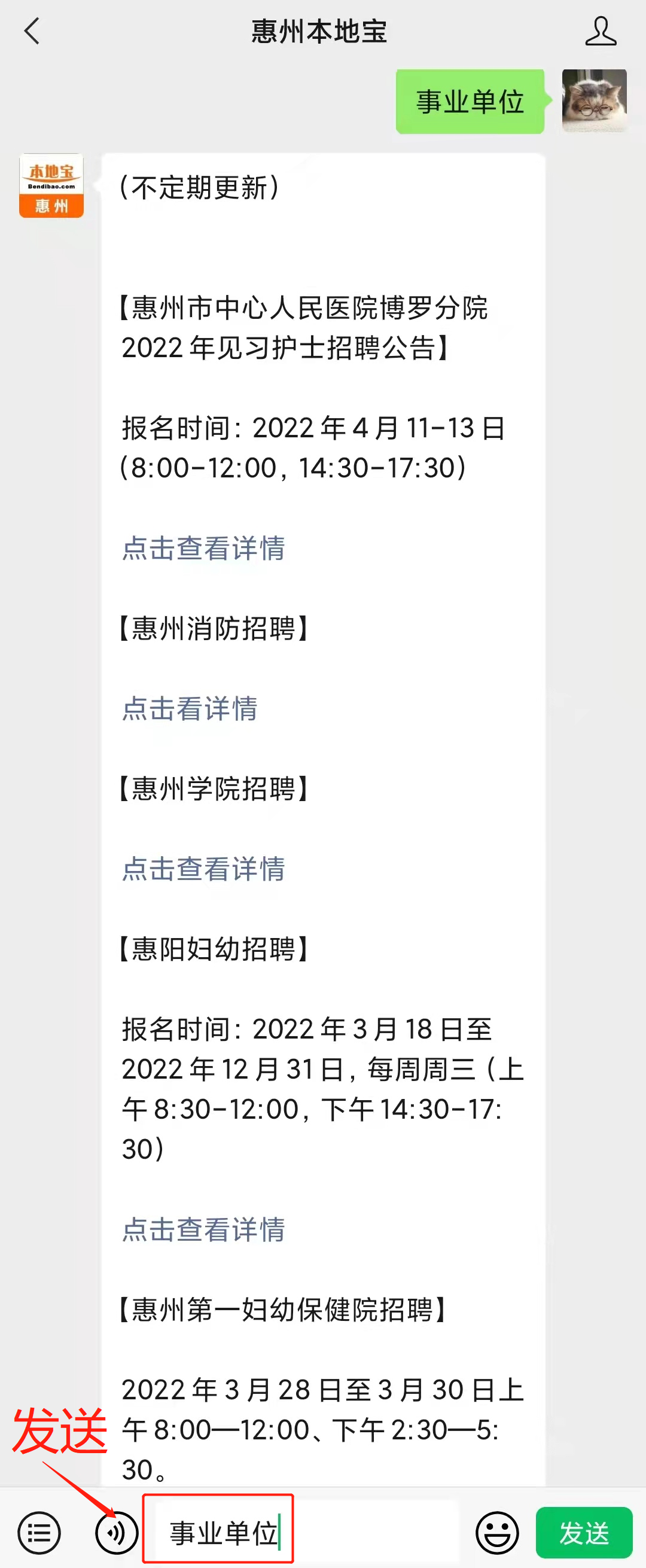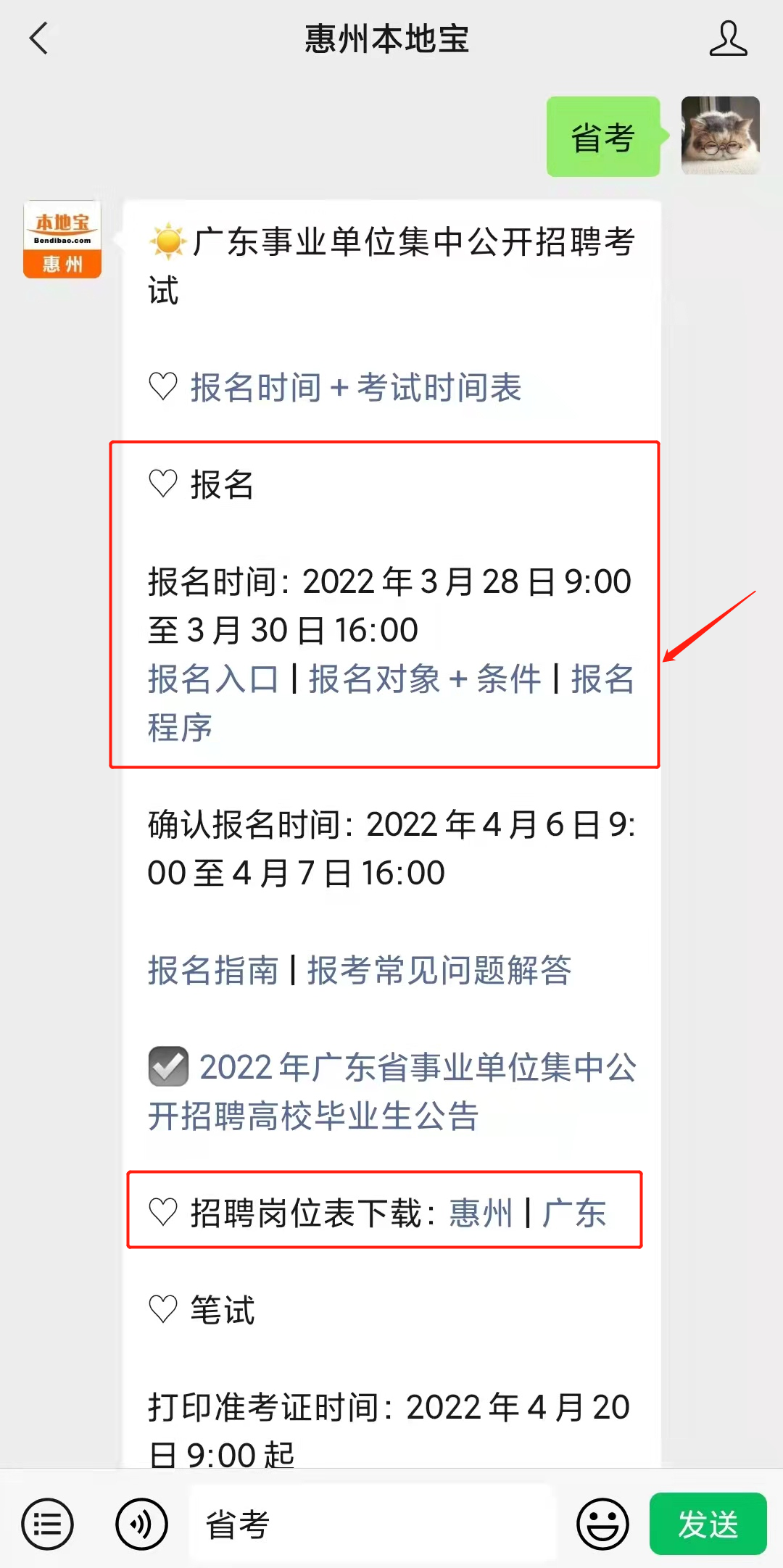 小编提示:点击这里查看详细的公告信息,在“惠州本地宝”微信对话框回复【省考】,即可进入2022年广东省考报名系统、报名指南、惠州/全省岗位信息等等。