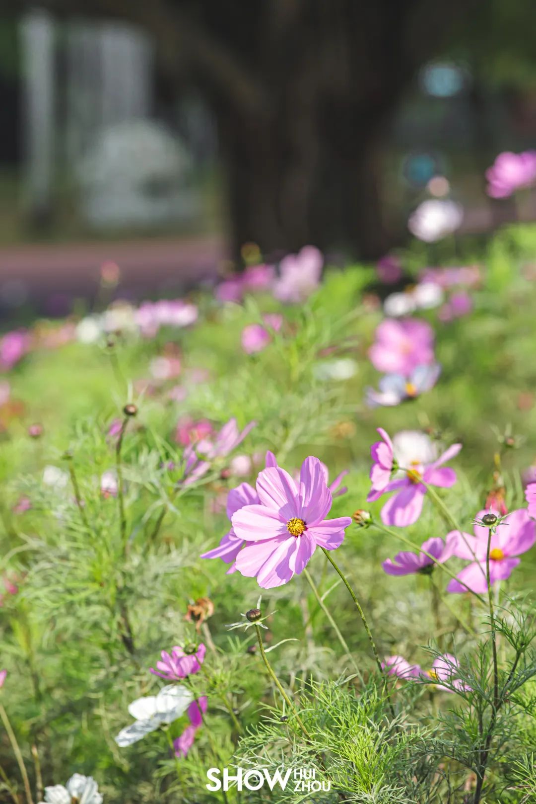 临近广场阶梯处,大片的波斯菊在春风抚慰下轻轻摇曳,似在欢迎前来的游人,传递永远快乐的花语。