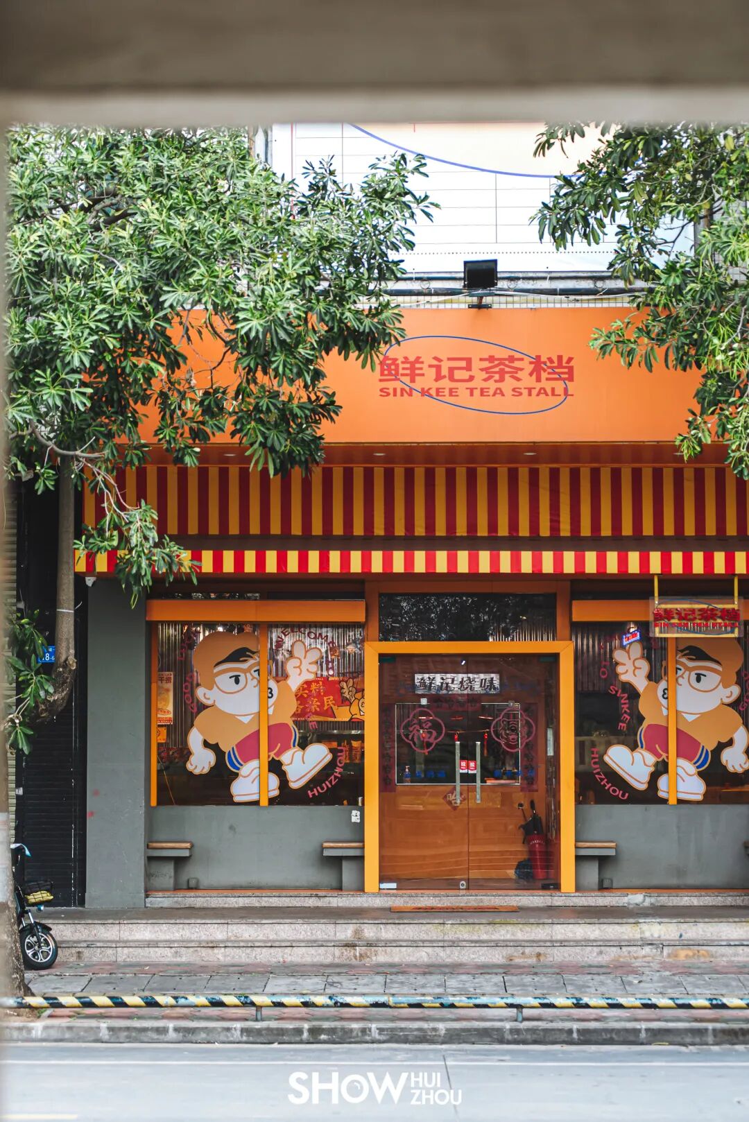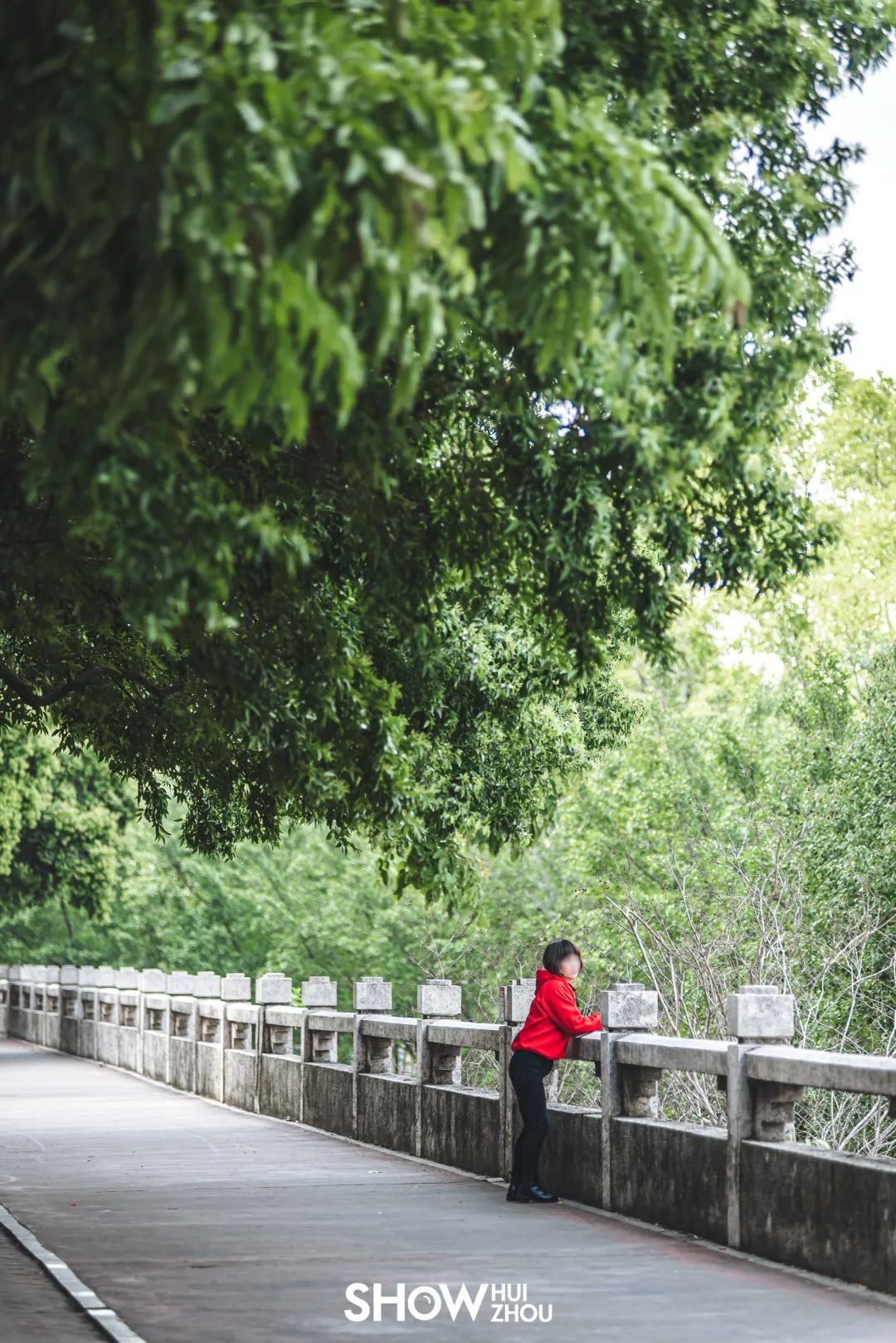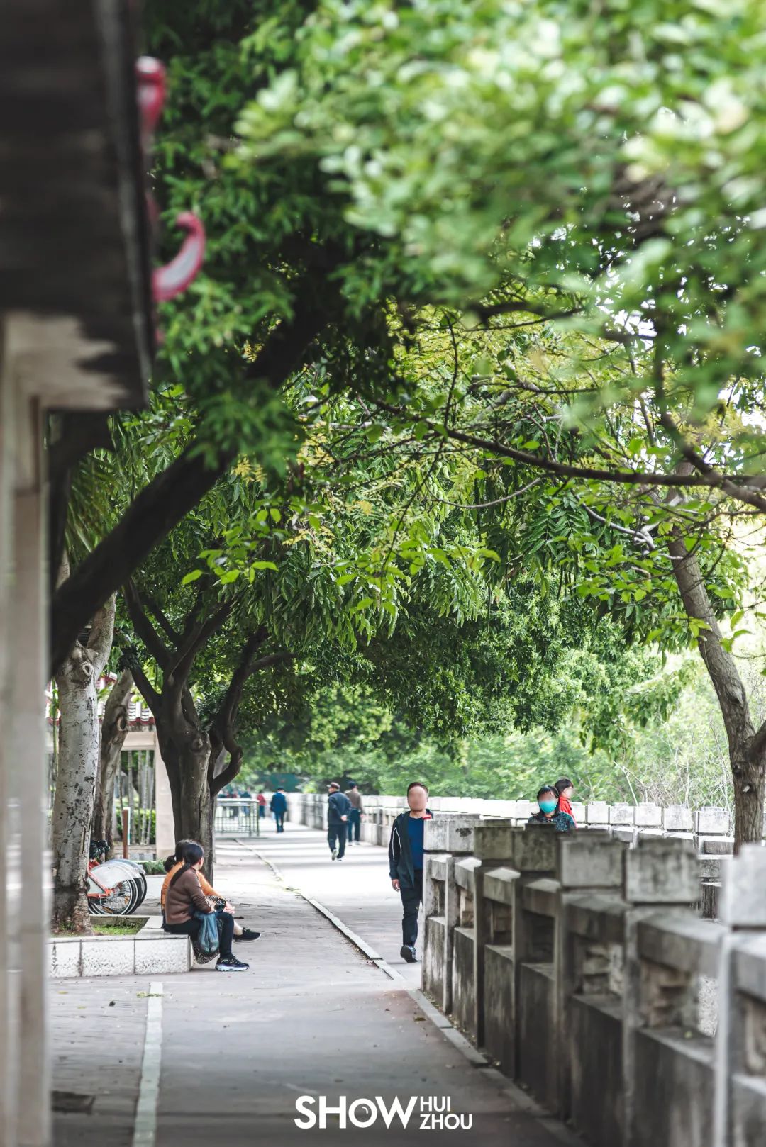店铺对面、惠沙堤一路右侧,有着高大的树、休息亭和斑驳围栏。白色中夹杂的灰黑青绿,是一道道时光印迹。