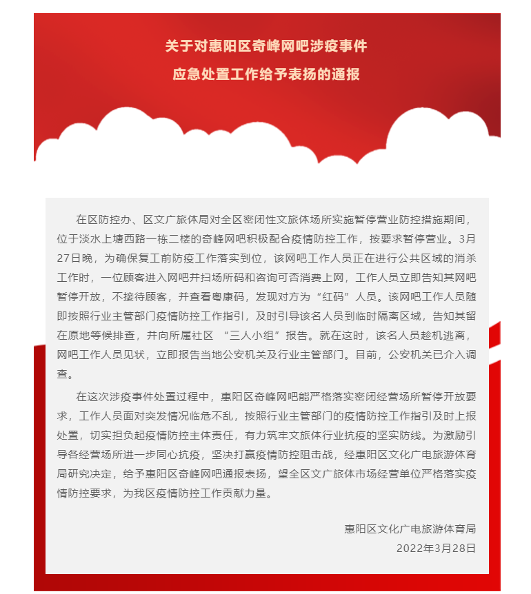 以下为通报全文:《关于对惠阳区奇峰网吧涉疫事件应急处置工作给予表扬的通报》