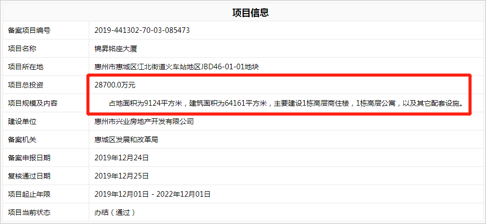 该项目此前由广东锦昇投资集团有限公司旗下公司惠州市兴业房地产开发有限公司以锦昇铭座大厦为案名报建。