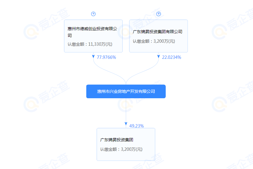 楼叔查询爱企查得知,惠州市兴业房地产开发有限公司最新的股权分配为,惠州市德威创业投资有限公司认缴金额为11330万元,占股超7.7成,占绝对的主导权,而原来的锦昇集团有限公司仅占股2.2成。