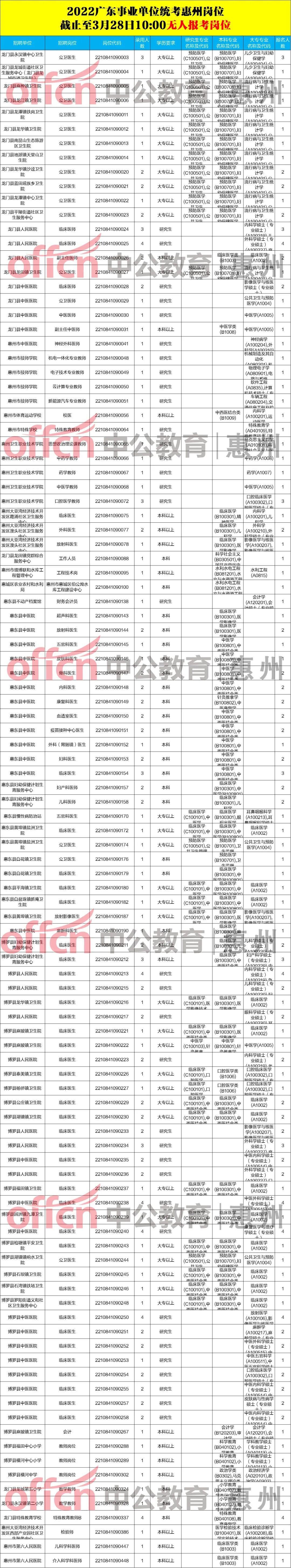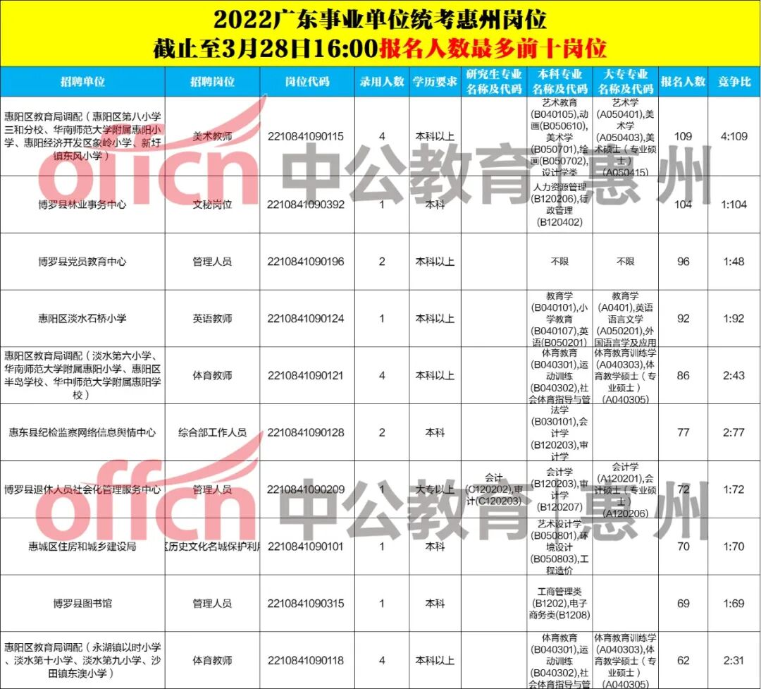 截止到3月28日16时,惠州地区报名人数较多的前十岗位主要集中在惠阳、博罗等地区单位以及部分教师岗位,具体岗位参考下图哦~