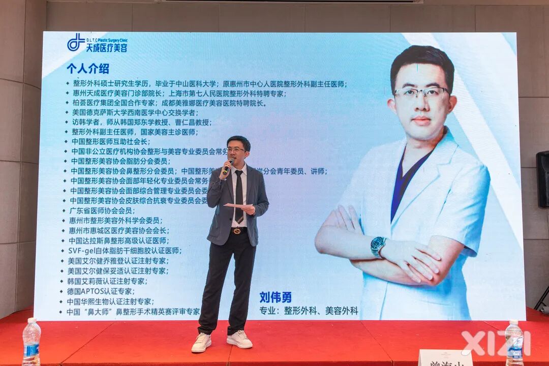 紧接着,天成医美创始人刘伟勇医生发表致辞,他给大家诠释了天成医美的发展历程,天成是“循证医学”的惠州医美机构,一直致力于为更多的求美者提供基于医学标准的医美服务。天成医美的核心是“三正规”(正规机构、正规医生、正规产品),根据每一位求美者需求,提供个性化治疗方案。美容门诊部参考港式医疗标准提供舒适的诊疗环境,采取预约制为求美者提供优质的私人医疗服务。