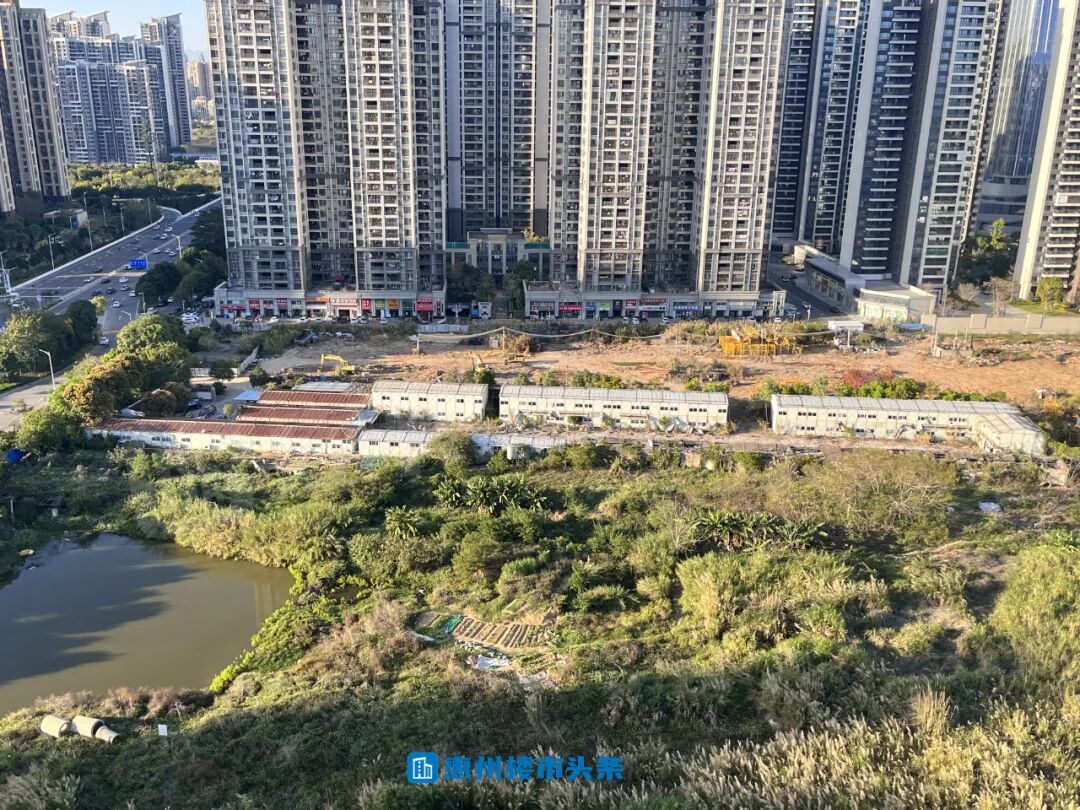 从高空上来看,可以发现地块上陈列了几排建设安置房,有部分位置的植被长势旺盛,还有人种菜的痕迹。地块内部分区域,因为陈年累月的洗刷,还成为了一片小水塘。