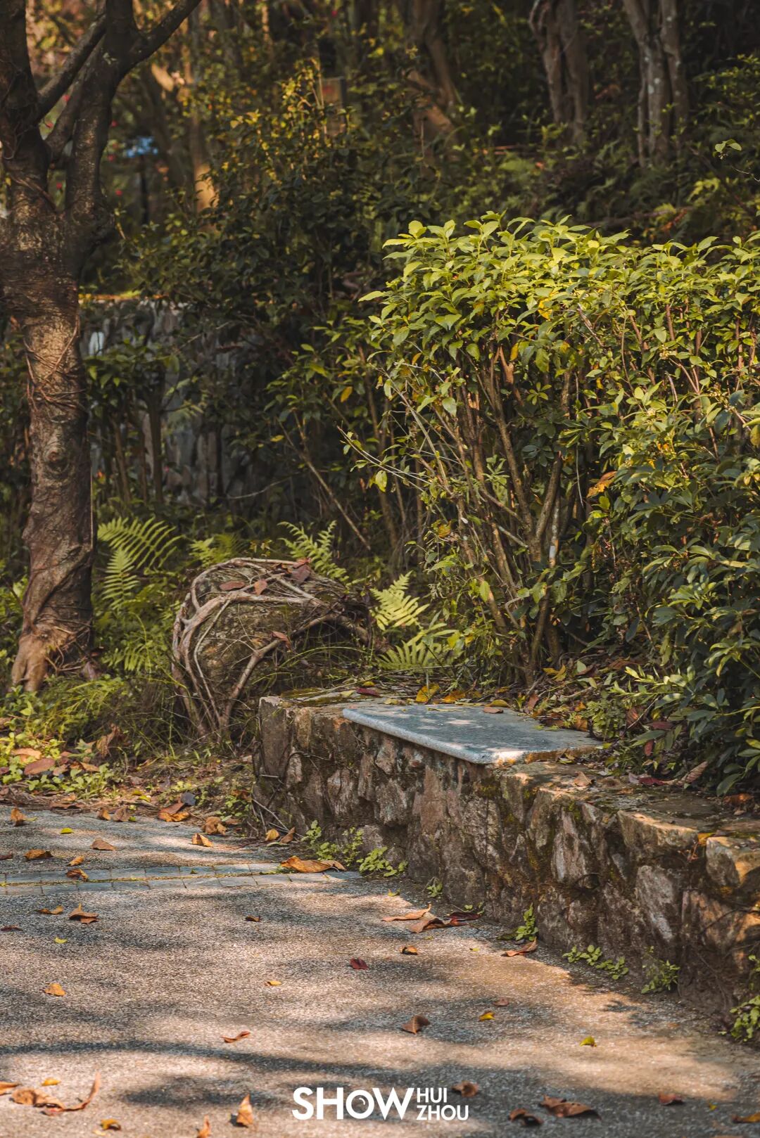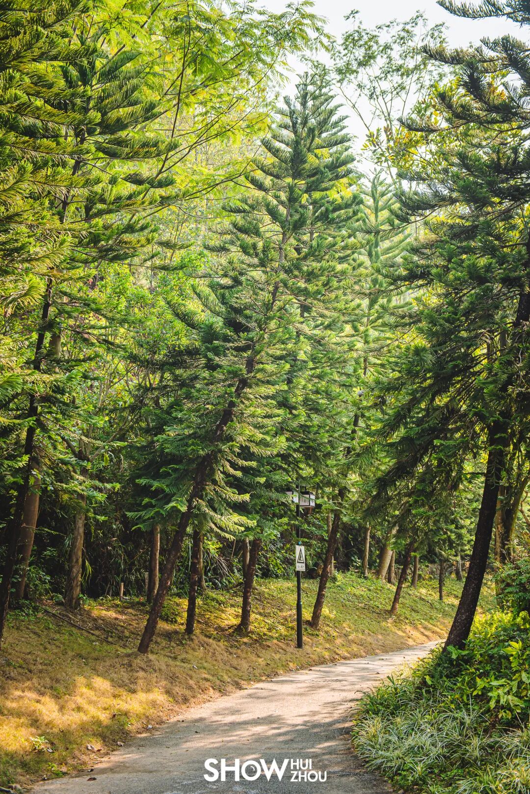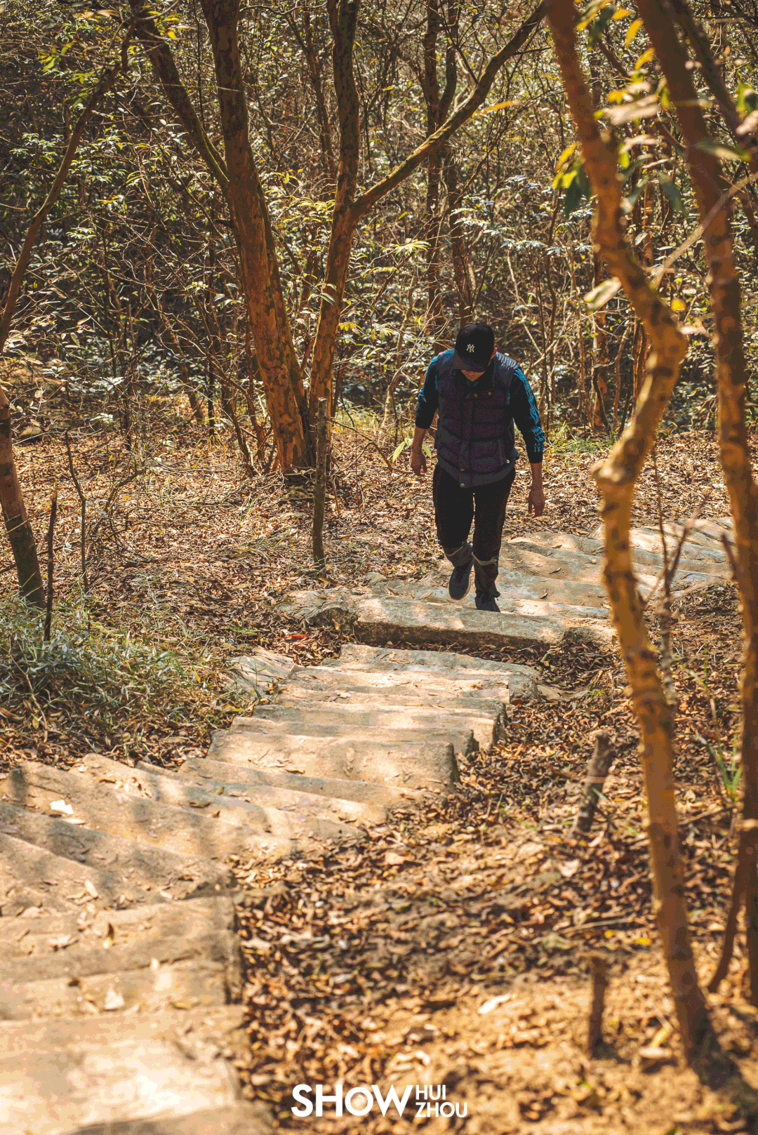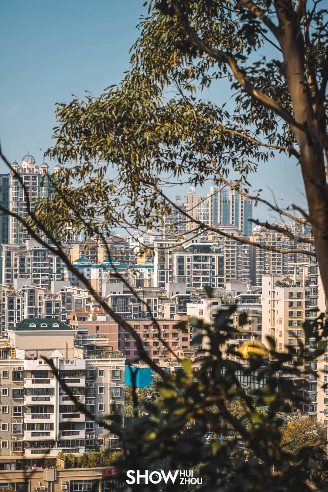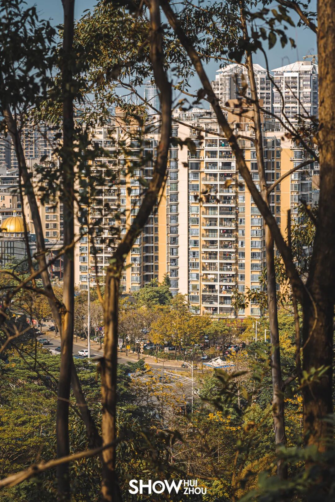 登一小段,可于树荫中窥探惠州南部新城高楼。