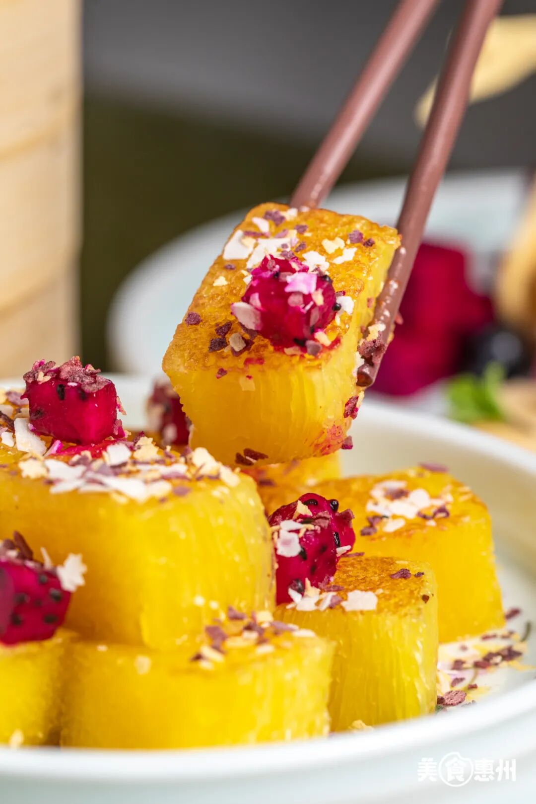 煎好的黄金糕,散发着阵阵椰香,边缘带有微微焦脆,鱼翅丝状的结构,厚度十足,吃起来又弹又有韧劲!