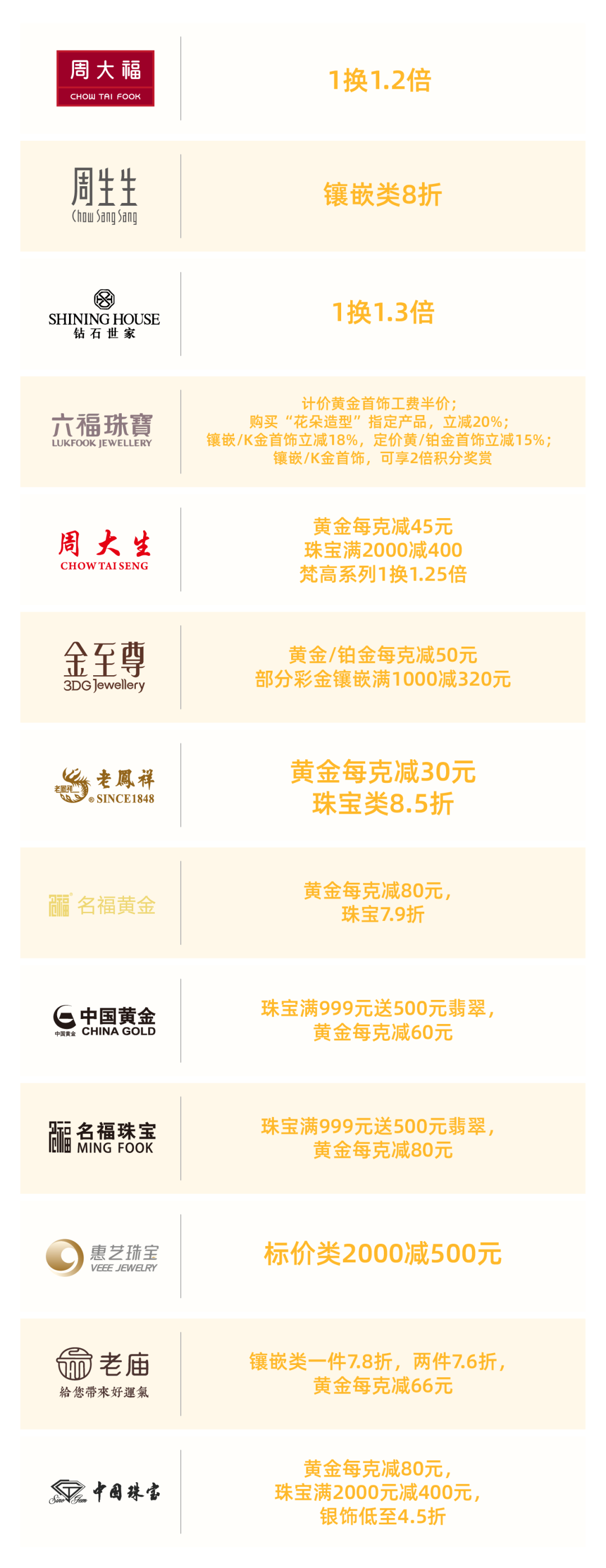 周大福:部分1.2倍 周生生:镶嵌类8折