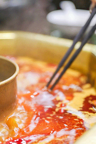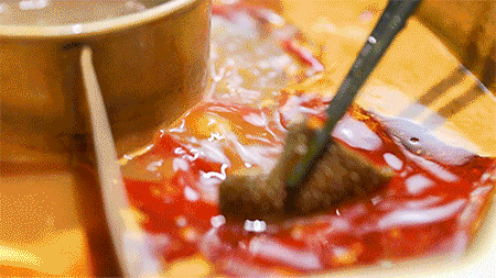 在火锅里涮个8秒即可捞起,刚从油锅里捞出来的毛肚,上面坚挺的小刺还挂着红油和辣椒,看起来格外诱惑,一口吃下,脆脆嫩嫩的~