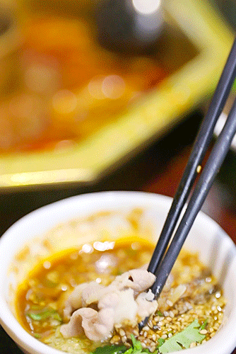 粉粉嫩嫩的鹅肠一下锅就翻腾起来,七上八下涮个十几秒后直接拎起,透着粉嫩的鹅肠,入口满是麻辣牛油香,切记一定不要放过蘸料,一口塞最佳!