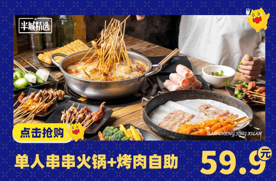 59.9元抢单人串串火锅+烤肉自助!全场签串任吃,更有热菜/炸物/水果…超多菜品不限量!