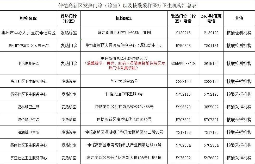仲恺高新区发热门诊(诊室)以及核酸采样医疗卫生机构汇总表