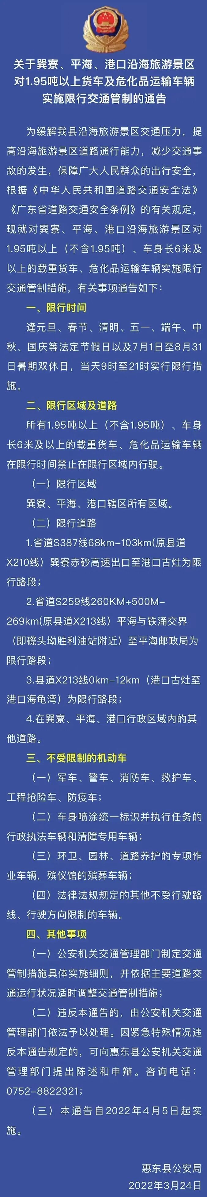 ①限行区域:巽寮、平海、港口辖区所有区域。