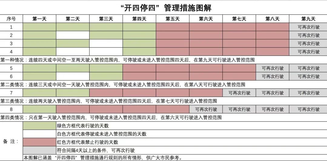开四停四:非广州市籍中小客车(含临时号牌车辆)驶入管控区域连续行驶时间最长不得超过4天(自然日,下同),再次驶入须间隔4天以上。