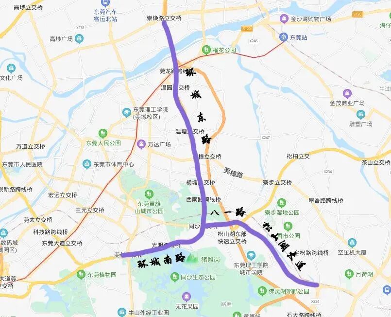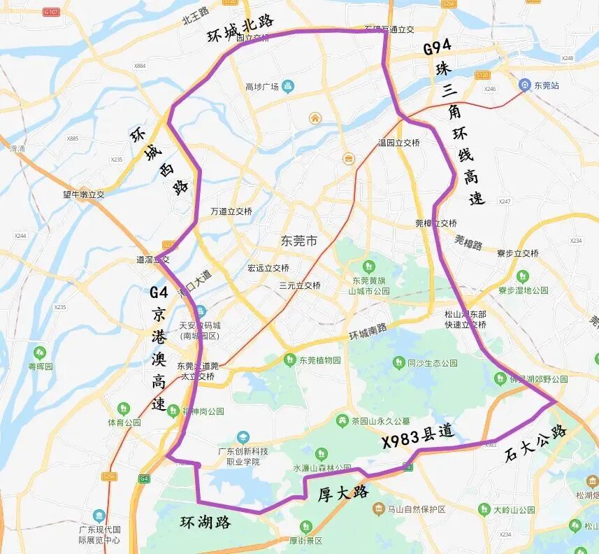 禁行区域:环城南路(莞长立交)一环城东路(崇焕立交),八一路(同沙立交)一松山湖大道(石大立交)路段