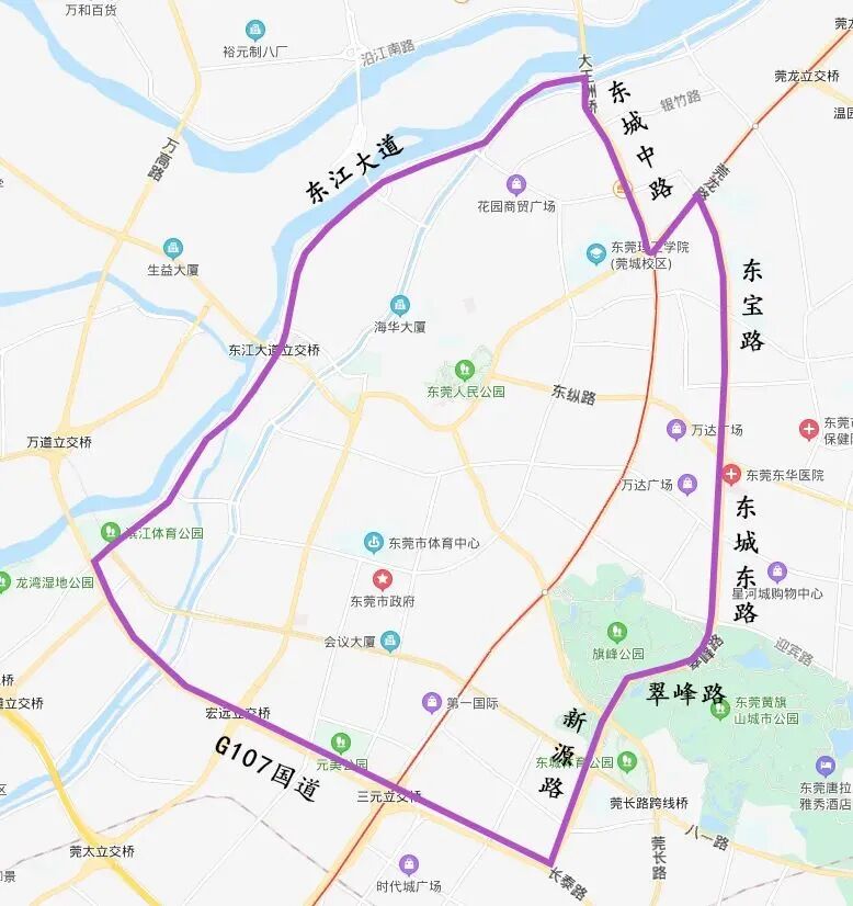 禁行区域:东宝路一东城东路一翠峰路一新源路一G107国道一东江大道一东城中路一莞龙路一东宝路连接范围以内(不含上述边界道路)