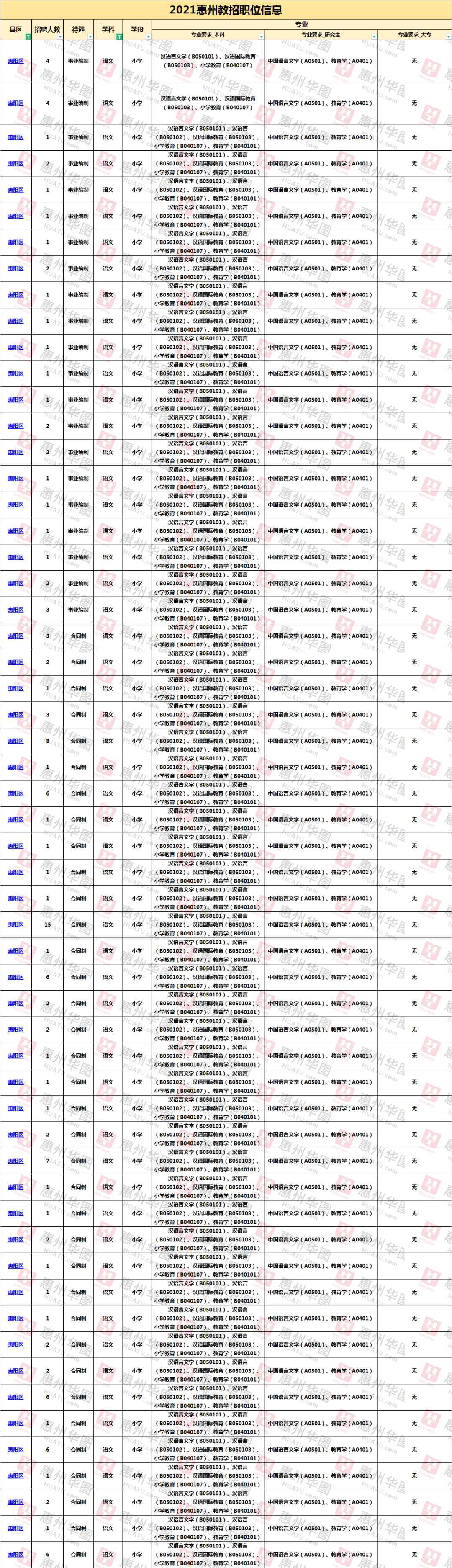 2021年,惠阳区教招语文学科共招录134人,全招小学岗。