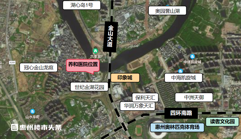 金山新城内,除了上文讲述的养和医院,目前只有惠州市第一妇幼保健院、惠州市华康骨科医院,再往南只有一家规模较小的民营医院演达医院。