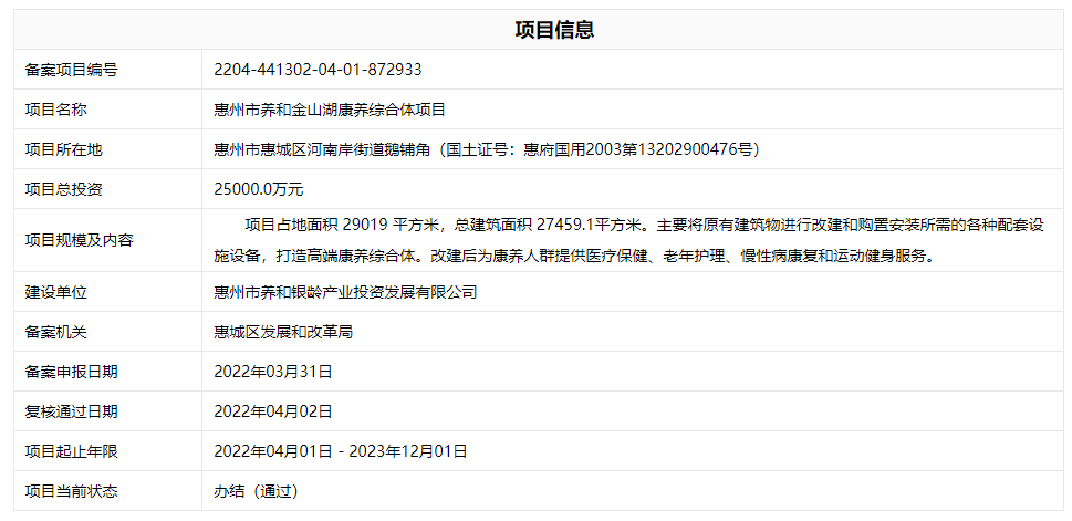 金山湖湖心片区外围片区(惠城区河南岸街道鹅铺角)将建设一个康养综合体,为惠州市养和银龄产业投资发展有限公司建设。
