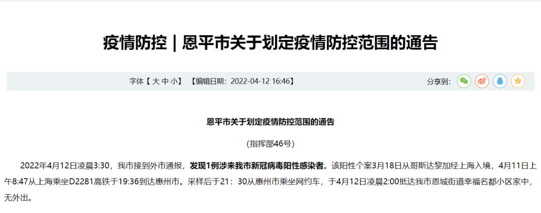 该阳性个案3月18日从哥斯达黎加经上海入境,4月11日上午8:47从上海乘坐D2281高铁于19:36到达惠州市。采样后于21:30从惠州市乘坐网约车,于4月12日凌晨2:00抵达恩平市恩城街道幸福名都小区家中,无外出。