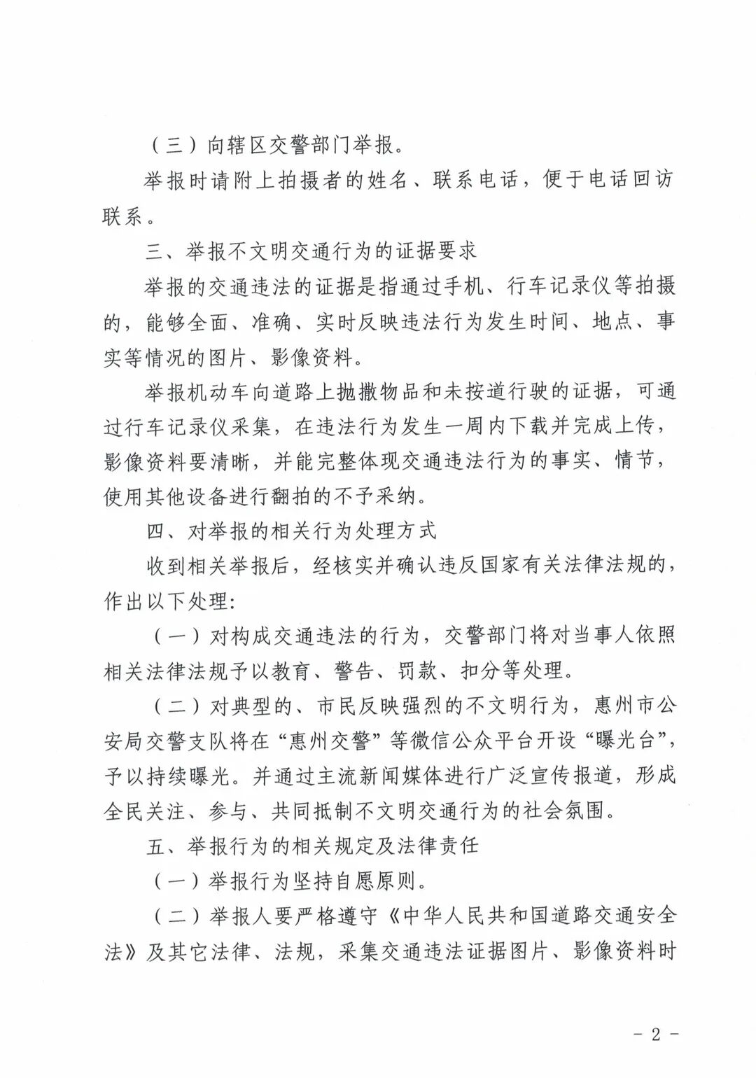 (二)对典型的、市民反映强烈的不文明行为,惠州市公安局交警支队将在“惠州交警”等微信公众平台开设“曝光台”,予以持续曝光。并通过主流新闻媒体进行广泛宣传报道,形成全民关注、参与、共同抵制不文明交通行为的社会氛围。