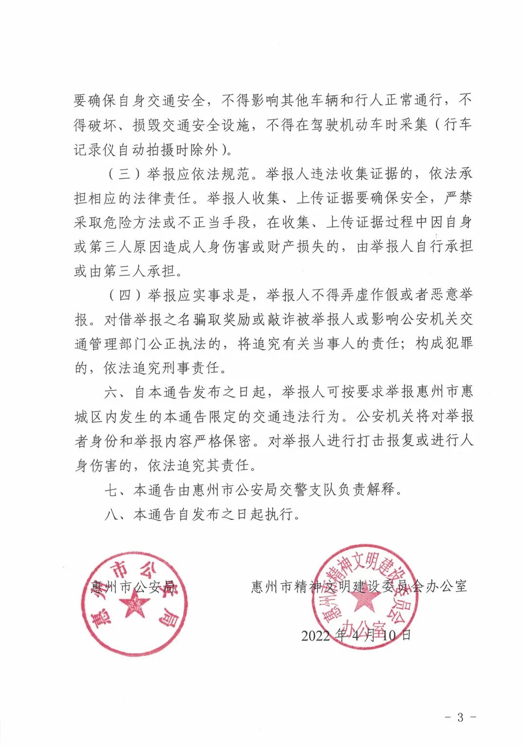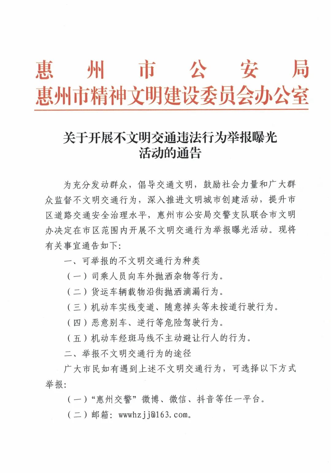 为充分发动群众,倡导交通文明,鼓励社会力量和广大群众监督不文明交通行为,深入推进文明城市创建活动,提升市区道路交通安全治理水平,惠州市公安局交警支队联合市文明办决定在市区范围内开展不文明交通行为举报曝光活动。