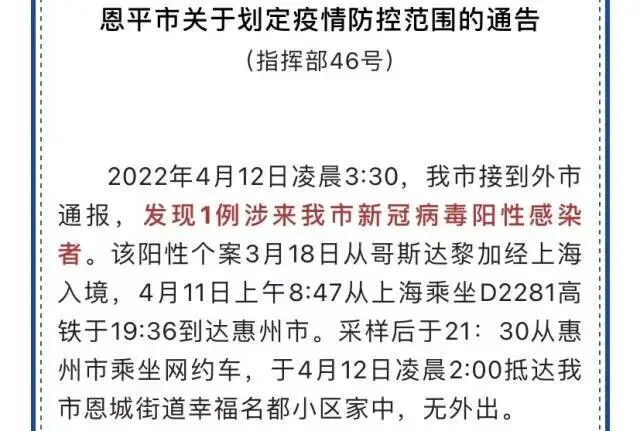 4月12日中午,江门恩平市新型冠状病毒肺炎疫情防控指挥部办公室对外发布通告称,4月12日凌晨3:30,恩平市接到外市通报,发现1例涉来恩平新冠病毒阳性感染者。该阳性个案3月18日从哥斯达黎加经上海入境,4月11日上午8:47从上海乘坐D2281高铁于19:36到达惠州市。采样后于21:30从惠州市乘坐网约车,于4月12日凌晨2:00抵达恩平市恩城街道幸福名都小区家中,无外出。