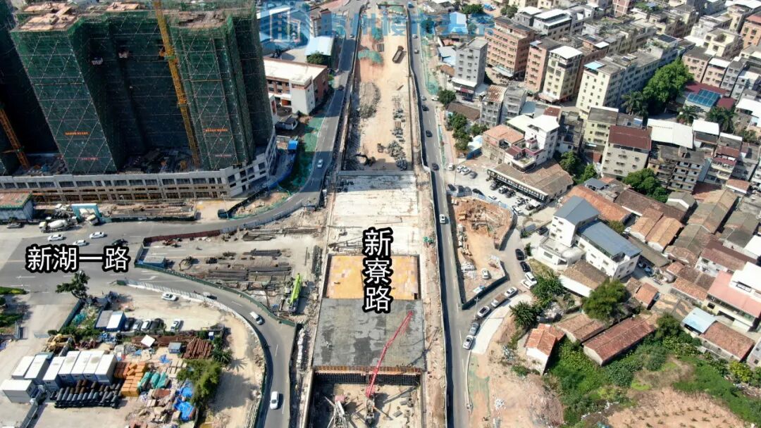 交叉口以下穿通道形式建设,附近有在建住宅项目金满庭。从航拍图看来,现场停留的施工机器较多。