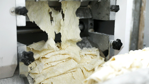 机器碾成纸片薄度,之后再进行揉拉,直至面粉变成丝丝面条,大小宽厚相差无几的面条新鲜送到厨房。明档式的操作台,汤底的香味已然翻涌。
