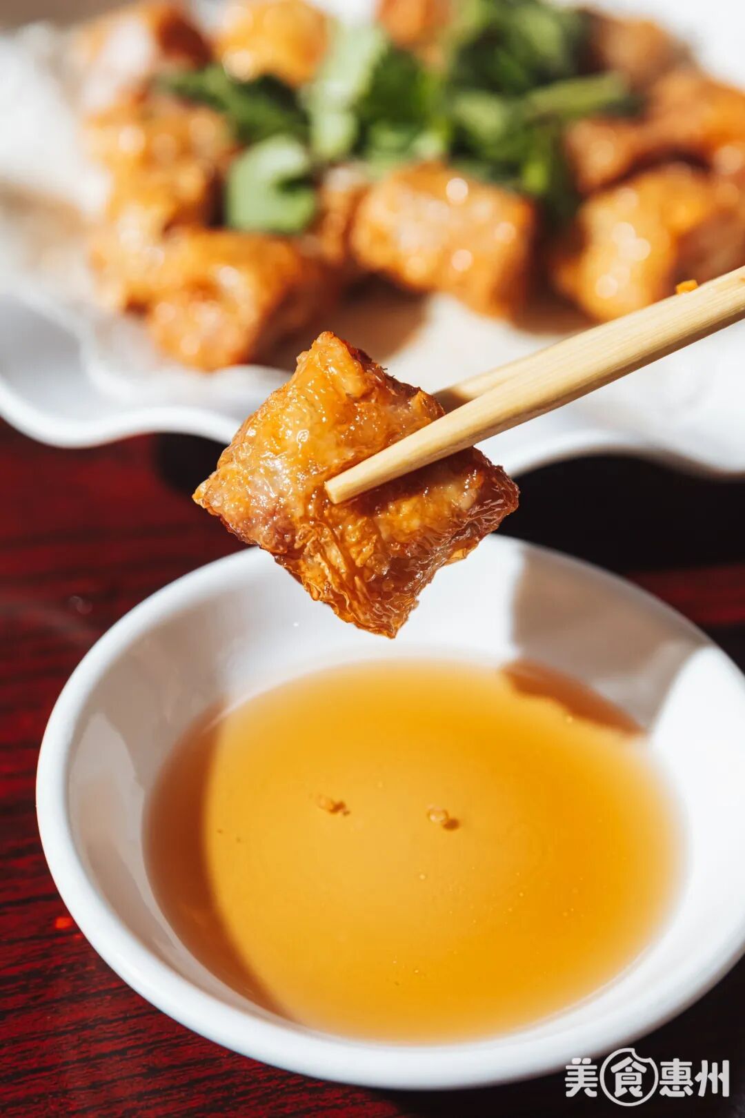 用腐皮、肉沫、马蹄为主要制作食材做成的炸粿肉,一个刚好入口,咬开炸的酥脆的腐皮,内里的肉馅多汁细嫩,还有清爽的马蹄碎越嚼越香。