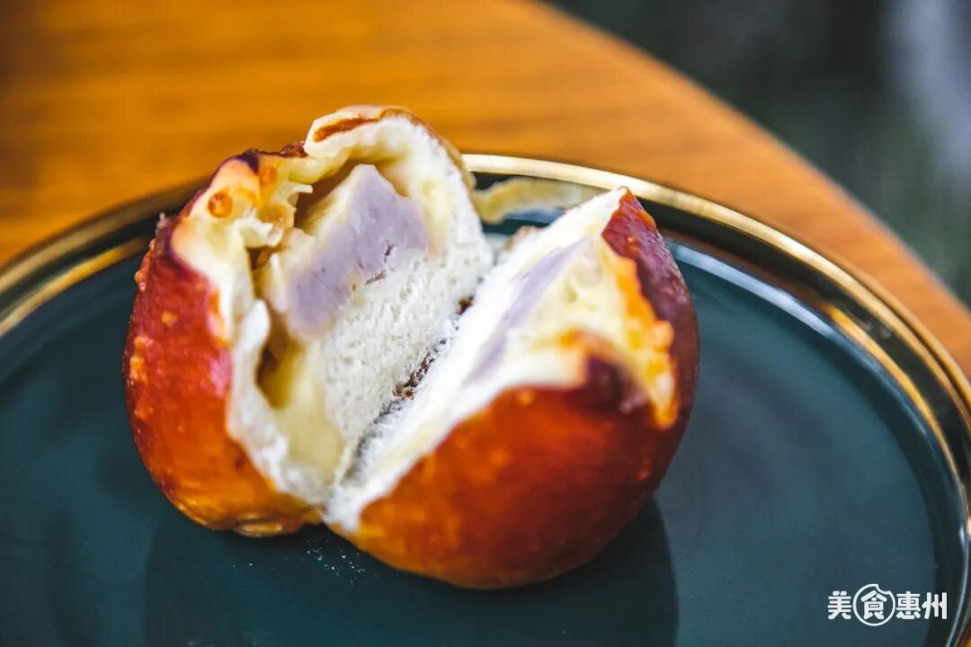 切开一半,厚实的芋泥被金黄微融的芝士包裹着,一口下去全是满足的味道,还真是盲选不踩雷。