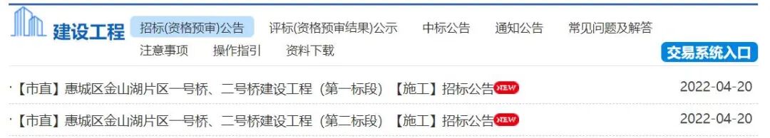 4月20日,惠州市公共资源交易中心发布《惠城区金山湖片区一号桥、二号桥建设工程(第一标段)【施工】招标公告》《惠城区金山湖片区一号桥、二号桥建设工程(第二标段)【施工】招标公告》,对金山湖片区一号桥、二号桥进行招标,距离正式动工又近了一步。
