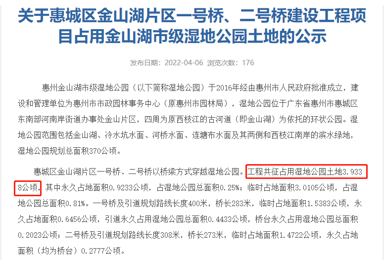 就在前几日(4月12日),惠城区自然资源局就公布了关于惠城区金山湖片区一号桥、二号桥建设工程项目占用金山湖市级湿地公园土地的公示,拟同意惠城区金山湖片区一号桥、二号桥占用和采用桥梁方式穿越惠州金山湖市级湿地公园土地。