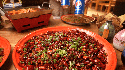 香酥软嫩的鸡肉吃起来极易上头,嗜辣的小编可以说是根本停不下来。每一份辣子鸡有足足一斤三两的鸡肉。专程用大家熟知的可乐放在旁边对比,足以见其分量有多给力。