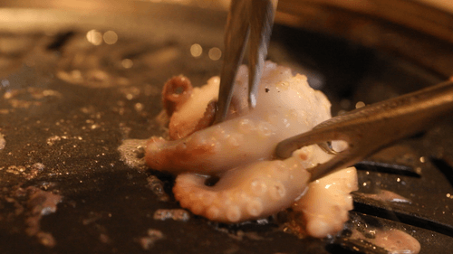 又白又嫩,滑溜溜的梅花章鱼,新鲜程度肉眼可见。只需烤上几分钟就能开吃,口感劲道弾牙,味道鲜美,直接吃或是蘸着酱吃都很过瘾。