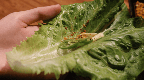 又或是拿上一片生菜,夹取三两片辣椒、蒜片,将肉蘸上喜欢的蘸料,包成一团,一大口塞入口中,香脆可口,美味至极,幸福感爆棚。