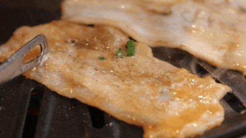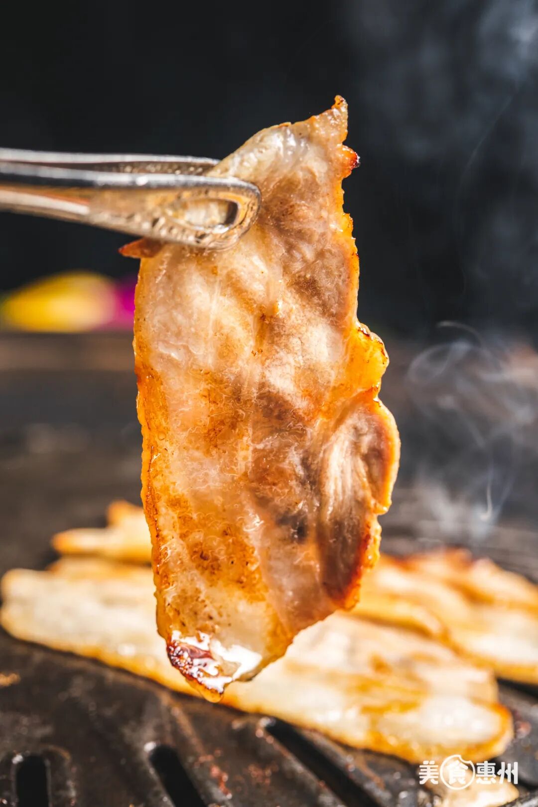 肥瘦相间的猪五花被均匀地切成薄片,拿起一片放在烤热的铁盘上,待油花融化,将粉色的五花翻弄几次,伴随着滋滋的声音,油花翻飞,香味四溢,颜色诱人。
